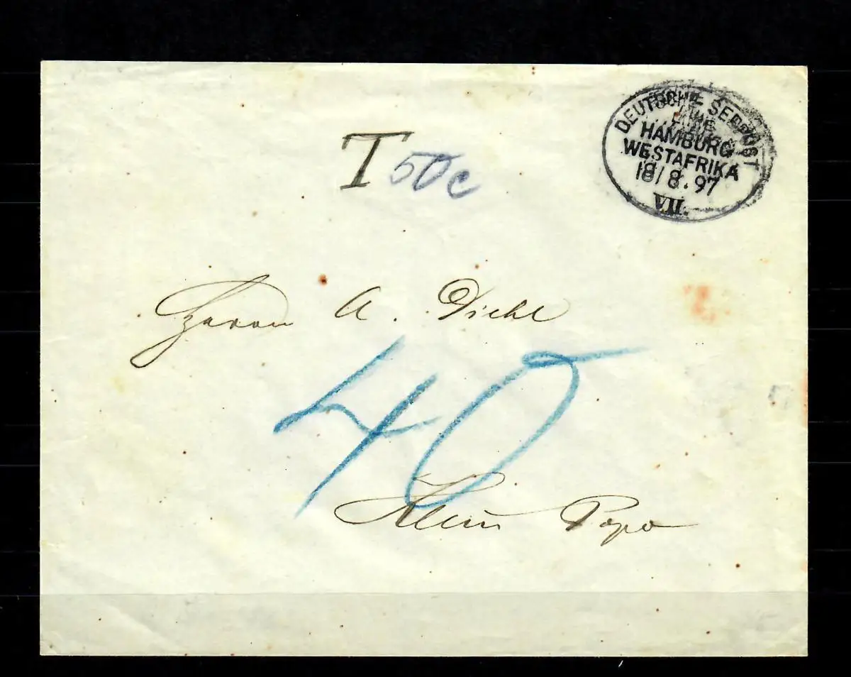 Deutsche Seepost Linie Hamburg-Westafrika 1897 auf Brief mit Carl Woermann vor Anlandung in Lome nach Klein -Popo. Brief war unterfrankiert wurde austaxiert und mit doppelter fehlender Taxe von 40 Pfg, Interessanter Seepost Beleg.