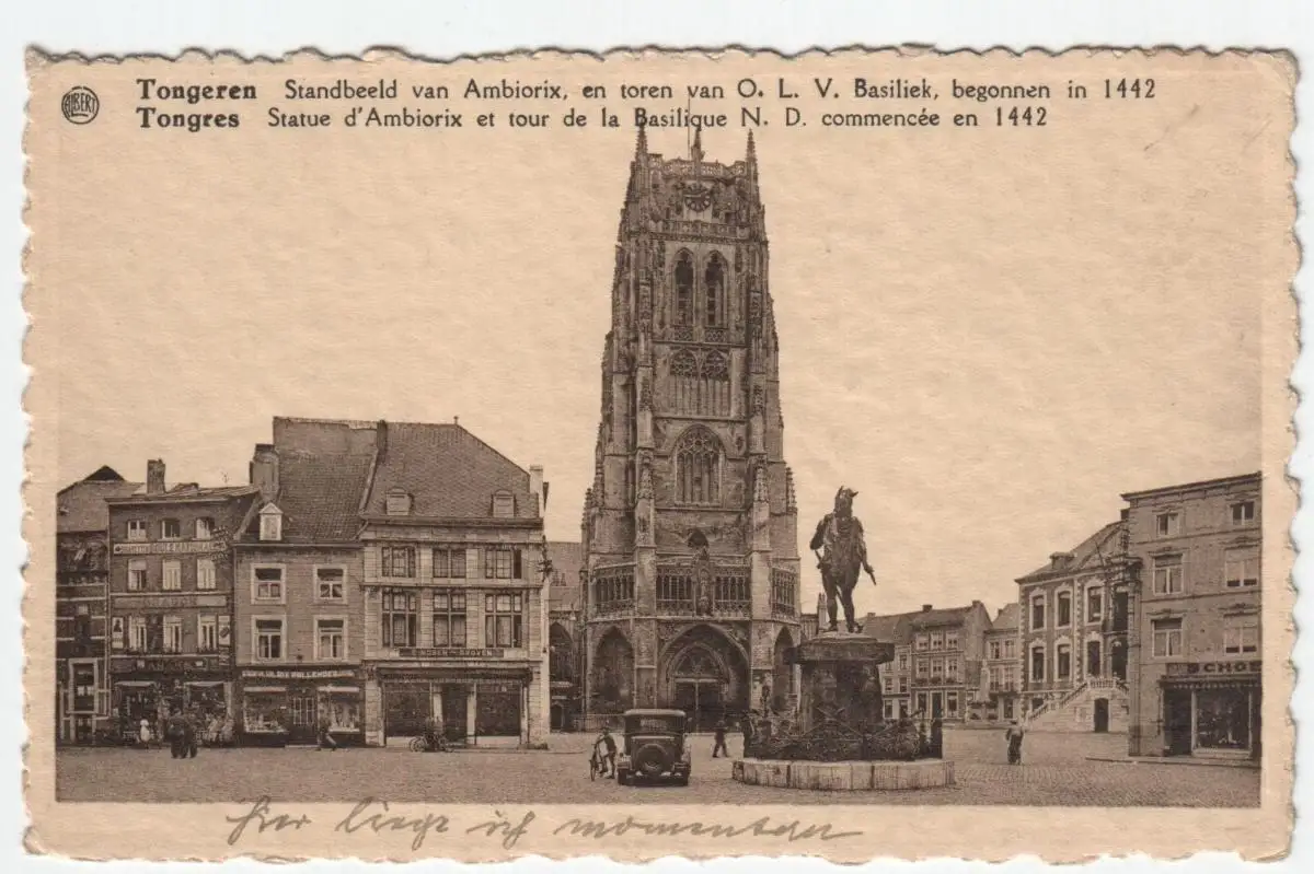 Tongres. Statue d Ambiorix et tour de la Basilique N.D. commencee en 1442 // Feldpost