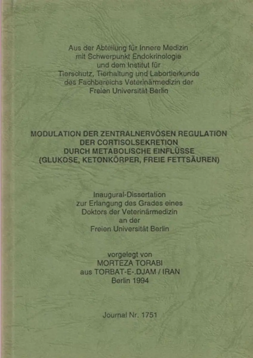 Torabi, Morteza: Modulation der zentralnervösen Regulation der Cortisolsekretion durch metabolische Einflüsse (Glukose, Ketonkörper, Freie Fettsäuren). Disseratation FU Berlin (Veterinärmedizin).