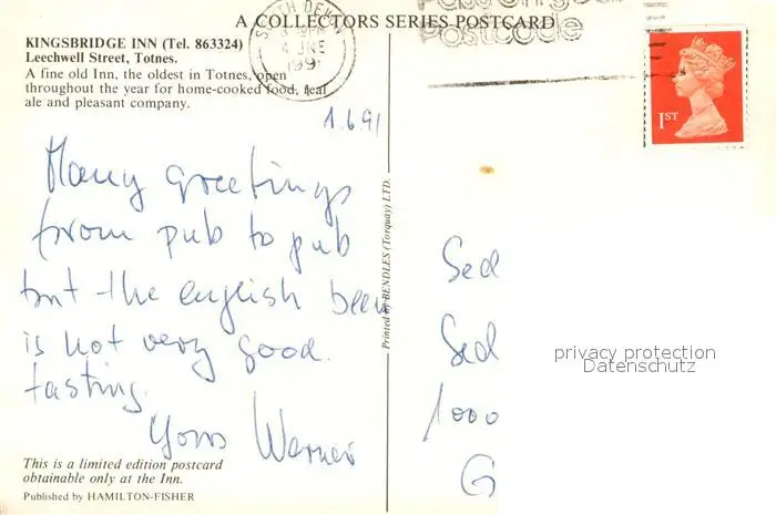 Totnes_Town Kingsbridge Inn Restaurant Bar Totnes Town postalisch gelaufen 1991 Erhaltung siehe scans [FriedD77] Frierer