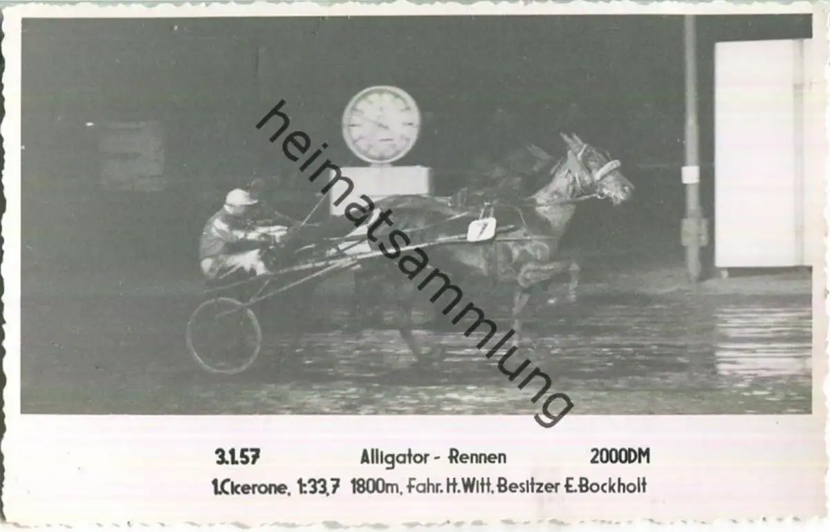 Trabrennen - Alligator Rennen - Ckerone - Fahrer Heinz Witt - Besitzer E. Bockholt - Foto-AK 03.01.1957 (G5124) *