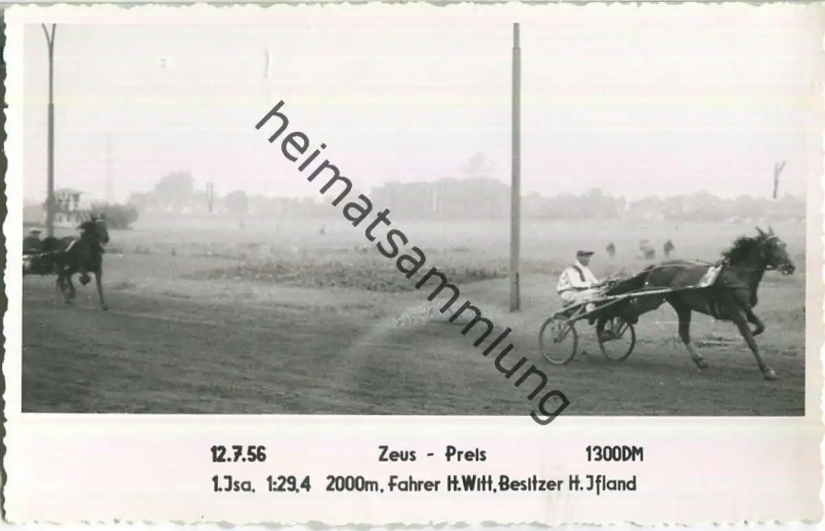 Trabrennen - Zeus Preis - Isa - Fahrer Heinz Witt - Besitzer H. Ifland - Foto-AK 12.07.1956