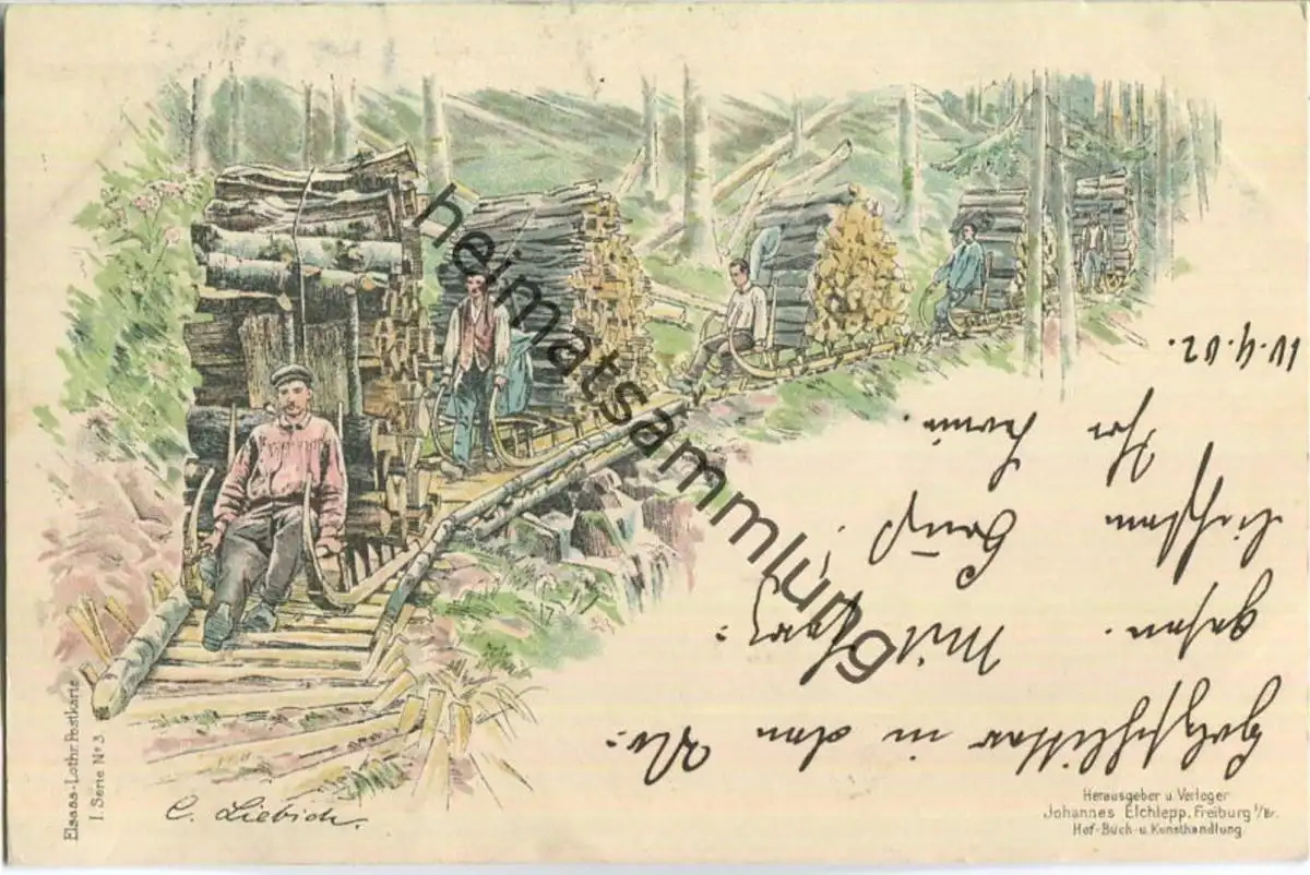 Transportschlitten - Holzschlitten - signiert C. Liebich - Elsass-Lothringen-Postkarte - Verlag Johannes Elchlepp Freiburg - Bahnpost (G16215) gel. 1902