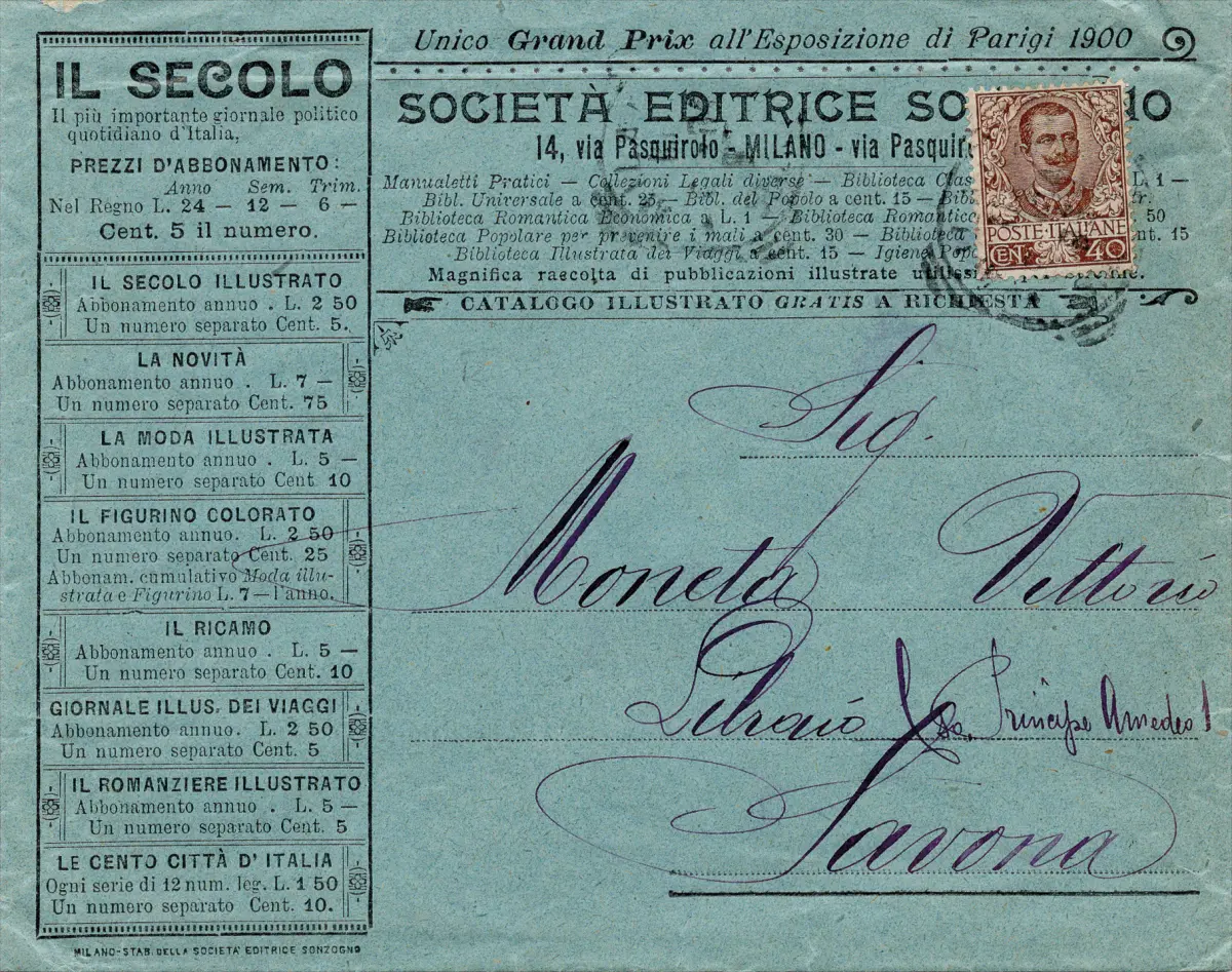 Umschlag - Società Editrice Sonzogno - Umschlag mit Werbung der verschiedenen Publikationen des Verlags, frankiert mit Cent. 40 Floreale Nr. 74 gereist nach Savona - Schön und ungewöhnlich Cod. 15/17