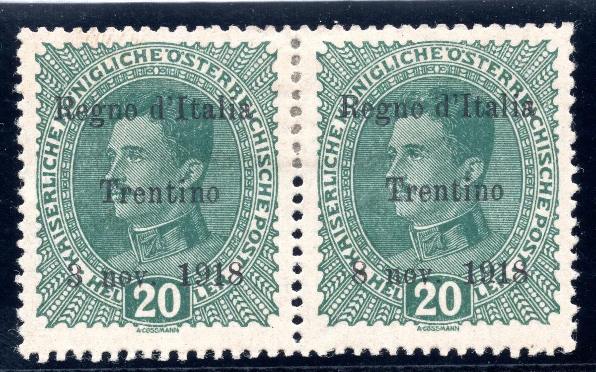 MH Linguellato - Trentino - Briefmarken Österreich 20 h. Aufgedruckt Nr. 7d Paar davon ein Exemplar mit Aufdruckfehler 8 Nov. statt 3 Nov. neu perfekt mit Linguella - Emilio Diena Katalog Euro750 Cod.2162/WEB