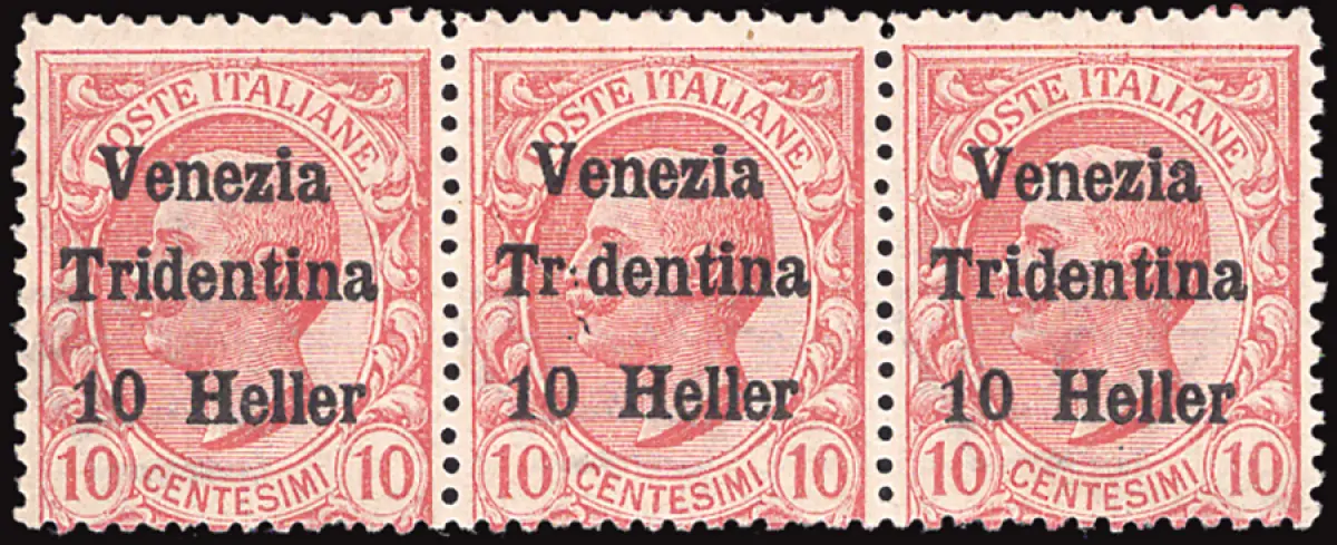 MH - Mit Linguella - - Trentino-Südtirol - 10 Heller Nr. 29cb Dreierstreifen, das Exemplar in der Mitte mit Kompositionsfehler Tr Dentin - leichte Spur von Linguella - Kat. euro 200+ Cod.936/182