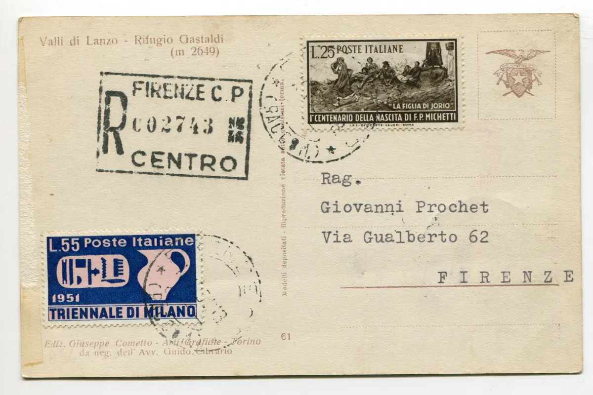 Triennale di Milano Lire 55 Nr. 667 + Ergänzung Nr. 671 auf Postkarte Postkarte - Triennale di Milano Lire 55 Nr. 667 + Ergänzung Nr. 671 auf Postkarte Racc. von Florenz nach Stadt am 16.10.51 Cod. 287/14