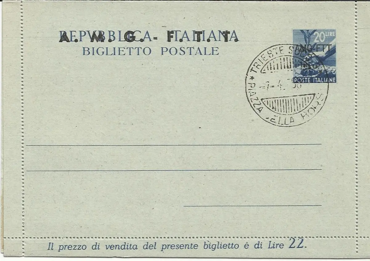 Triest A - B.P. Lire 20 Democratica Nr. B 3 großer Aufdruck - gebrauchte Postkarte - Triest A - B.P. Lire 20 Democratica Nr. B 3 großer Aufdruck - gebraucht, nicht gereist - perfekter Code Nr. 870/4