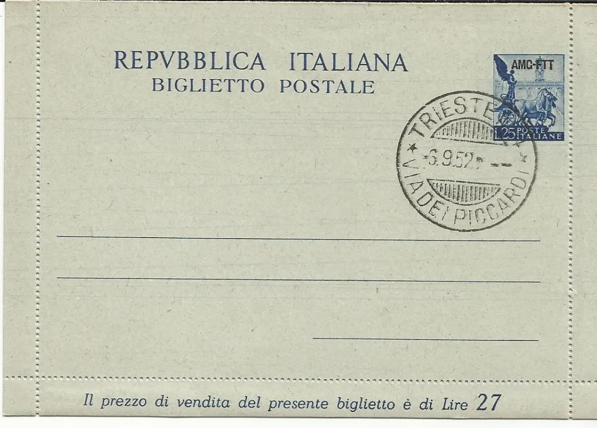 Triest A - B.P. Lire 25 Quadriga Nr. B 6 gebrauchte Postkarte - Triest A - B.P. Lire 25 Quadriga Nr. B 6 gebraucht FDC, nicht gereist Code Nr. 875/4