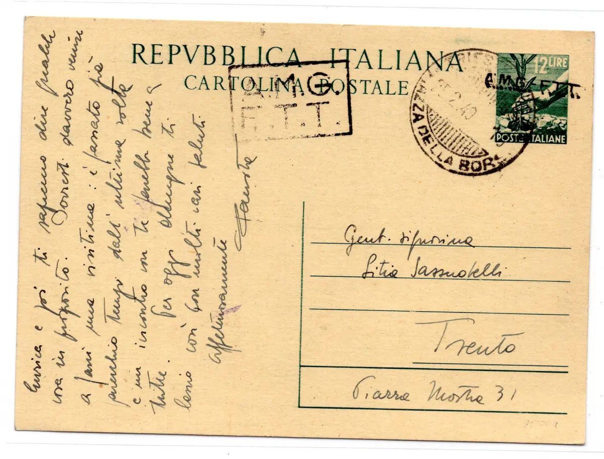 Postkarte - Triest A - C.P. 12 Lire Demokratischer Handaufdruck Typ A+B (Nr. C 3B) nach Triest gereist - wertvolle nicht philatelistische Postnutzung Cod. 1147/17