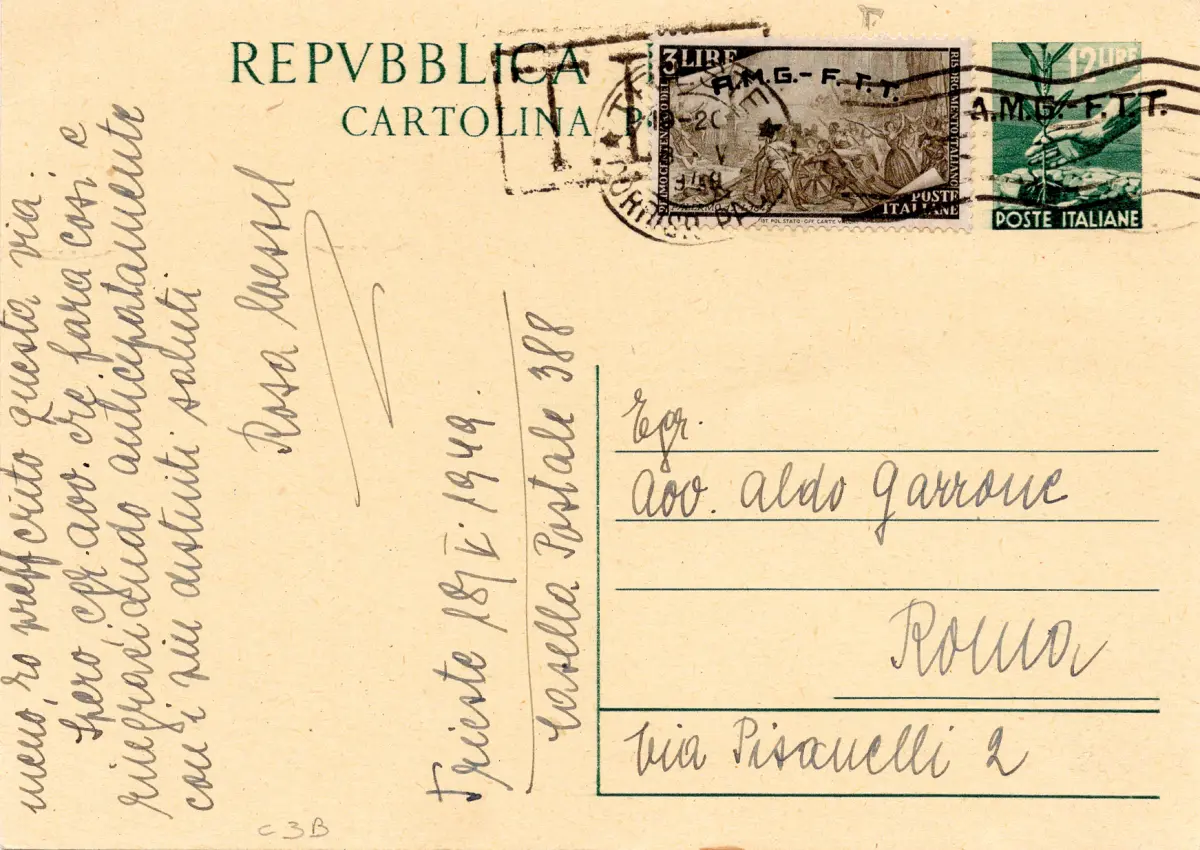 Postkarte - Triest A - C.P. Lire 12 Democratica Handaufdruck Typ A+C (Nr. C 3A) reiste am 18.5.49 mit Zusatzmarke l nach Triest. 3 Risorgimento (T-Sorte geschnitten - hochwertige nicht philatelistische Postverwendung Cod. 1148/17