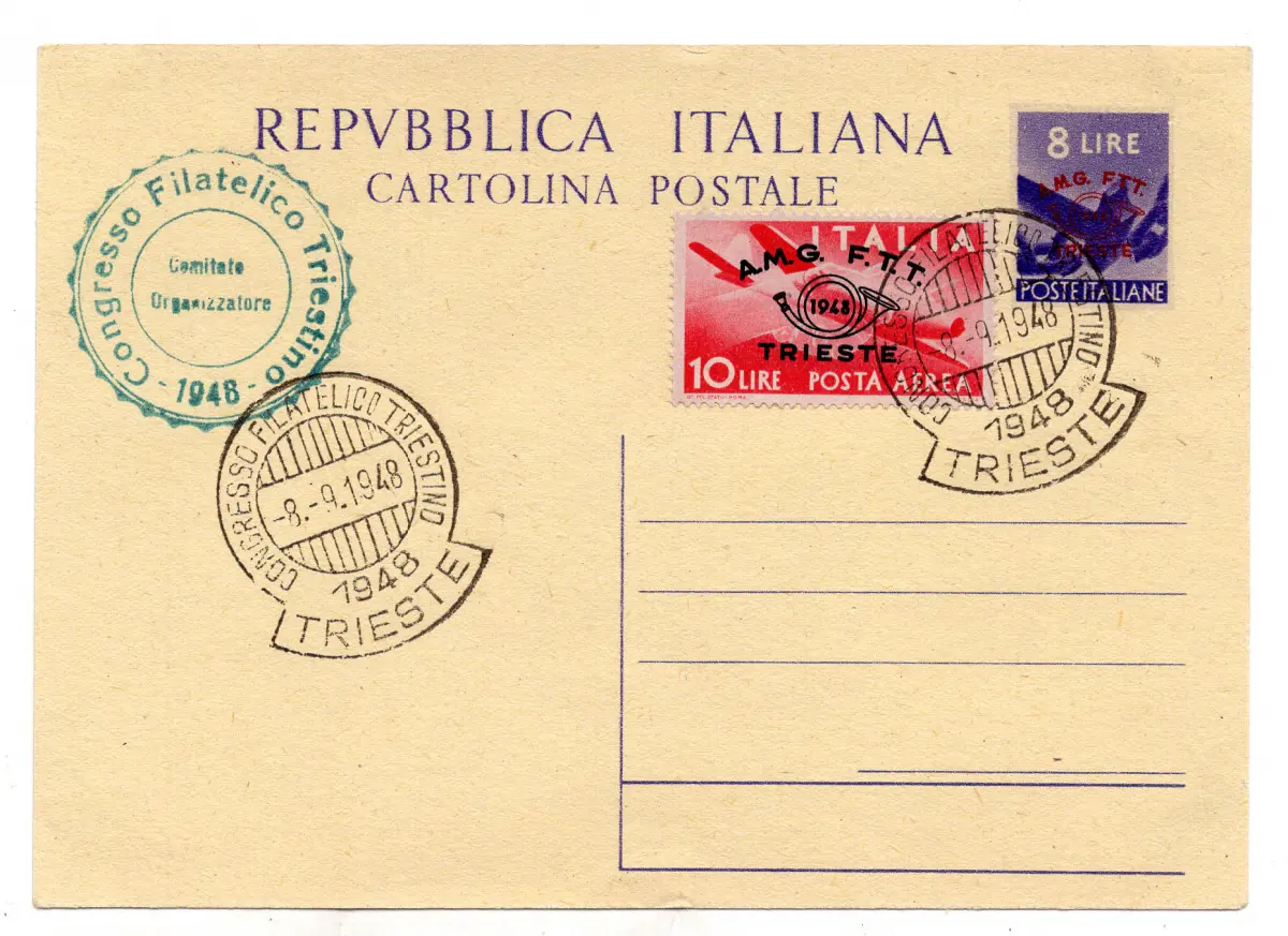 Triest A - C.P. Lire 8 Congress Filat. Triest Nr. C9 gebraucht mit Ann. special - Triest A - C.P. Lire 8 Congress Filat. Triest Nr. C9 gebraucht mit Ann. Sonderkongress Filat. 8.9.48 - nicht gereist - Kat. euro 55 n. 1372/20