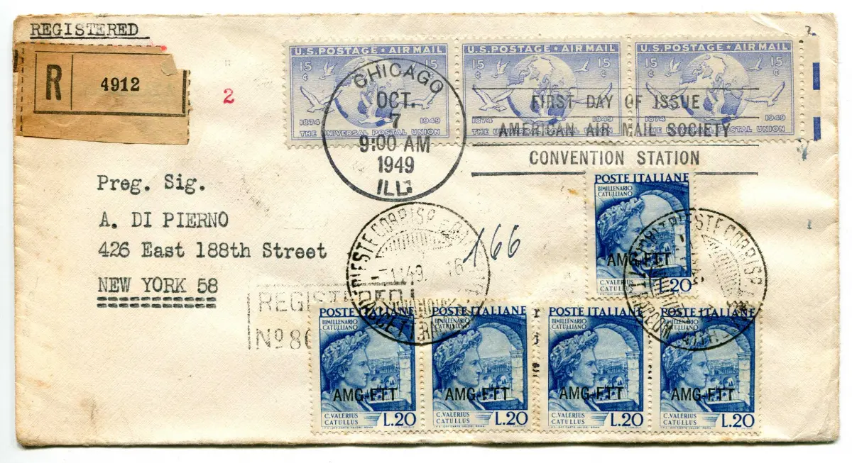 Catull fünf Exemplare auf Racc. für New York - Catull Nr. 55 fünf Exemplare auf Umschlag Racc. für New York am 7.11.49 - Der Umschlag enthält auch US-Frankatur für früheren Versand aus den USA nach Triest am 7.10.49 - Interessanter Code 859/8