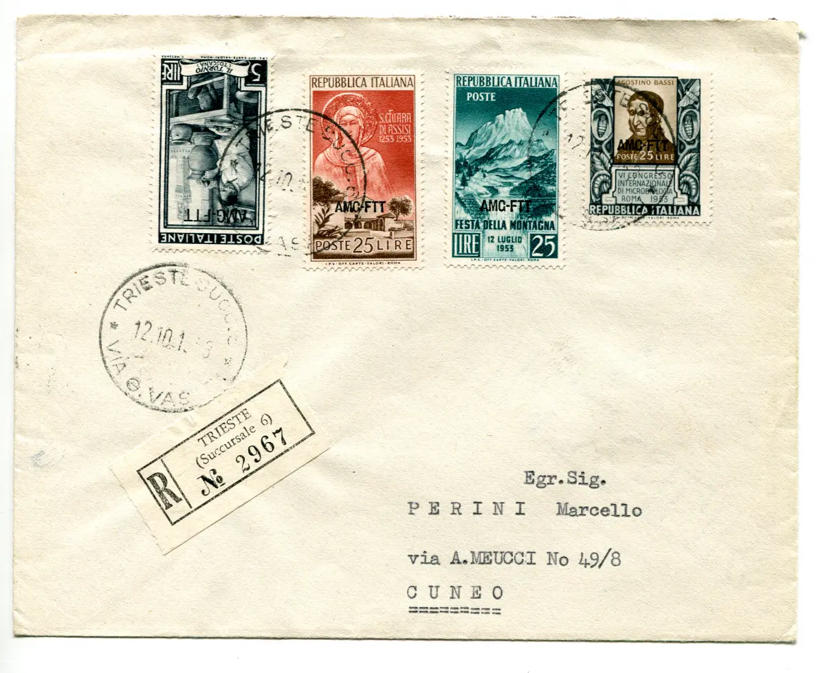 Umschlag - Triest A - Festa della Montagna Nr. 181 + Ergänzungen Nr. 92 + 177 + 187 auf Umschlag Racc. für Cuneo am 12.10.53 - Zwillingswerte im Tarif Cod.1498/WEB
