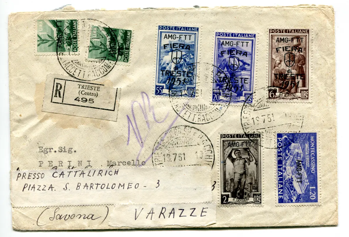Triest A - Fiera di Trieste 1951 auf Umschlag Racc. im Tarif Umschlag - Triest A - Fiera di Trieste 1951 Nr. 121/133 + Ergänzungen Nr. 56 x 2 + 91 + 119 auf Anschlussumschlag. für Cuneo am 13.7.51 - Schöne und ungewöhnliche Rücksendung wegen Adressänderung des Empfängers - zahlreiche Transit- und Ankunftsstornierungen - im Tarif Euro395 Cod.1484/WEB