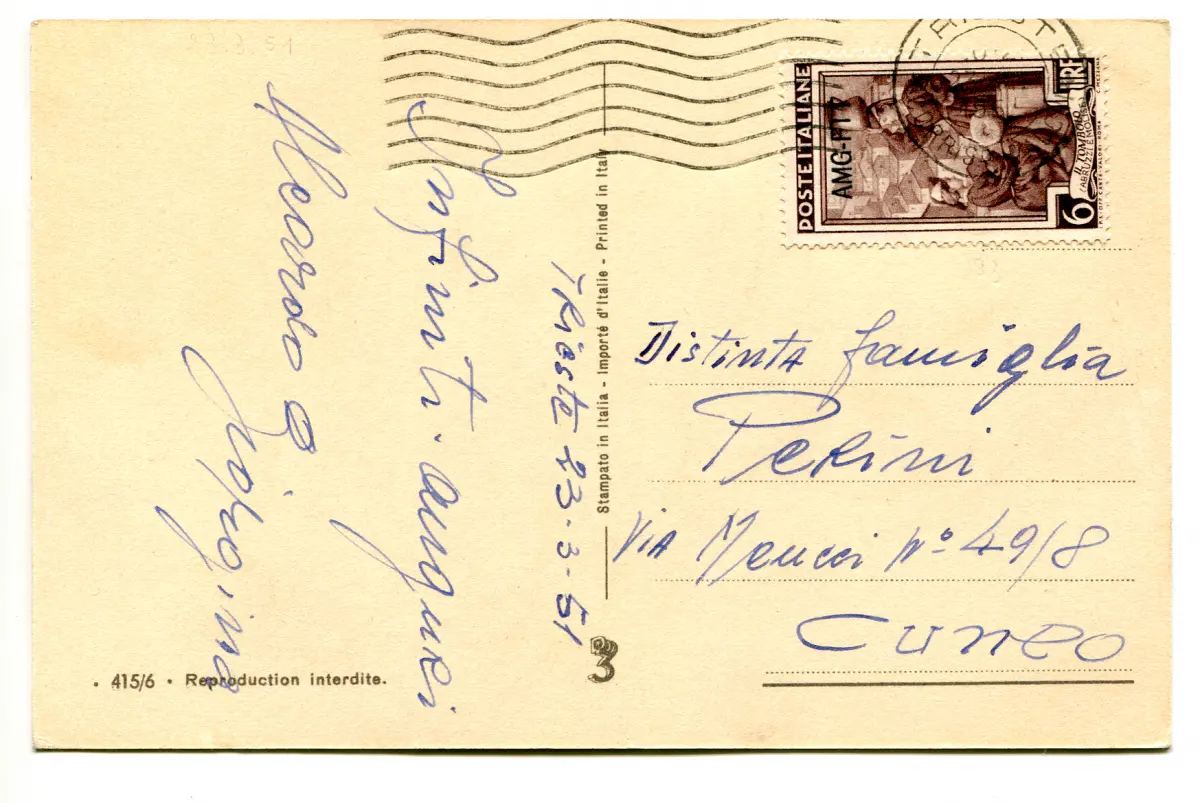 Triest A - Lavoro Lire 6 Nr. 93 isoliert auf Postkarte nach Cuneo am 23.3.51 - Im Tarif (bis zu 5 Wörter) - Ungewöhnlich Cod. 1515 / WEB