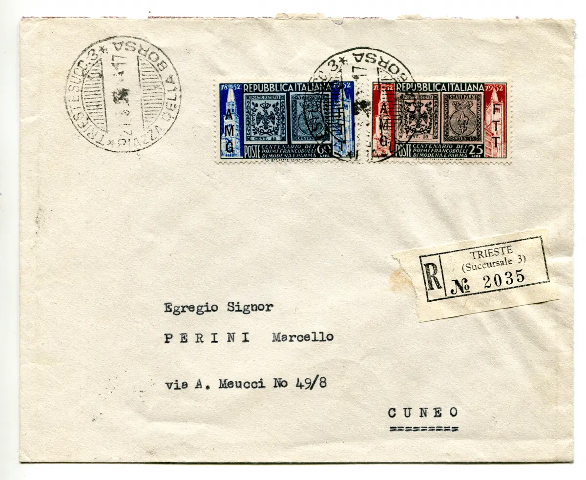 Umschlag - Triest A - Modena und Parma Nr. 147/148 Serie auf Umschlag Racc. für Cuneo am 24.6.52 Cod.1466/WEB