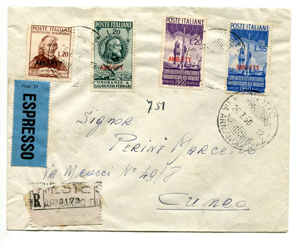 Triest A - Rundfunkserie auf Einschreiben Umschlag - Triest A - Rundfunk Nr. 76/77 Serie + Ergänzungen Nr. 75 + 78 auf Umschlag Racc. ausgedrückt am 26.7.50 - Schön und ungewöhnlich Cod.1485/WEB