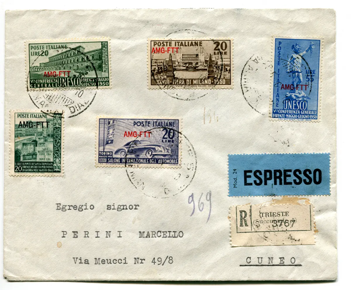 Triest A - UNESCO auf Umschlag Racc. espresso Umschlag - Trieste A - Unesco Nr. 71/72 Serie auf Umschlag mit Ergänzungen Nr. 54 + 69 + 70 gereist Racc. Express für Cuneo am 29.5.50 - Schön und ungewöhnlich Cod.1489/WEB
