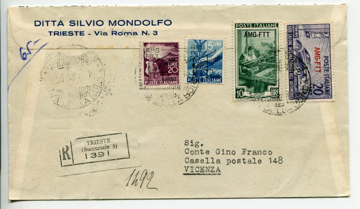 Triest - Auto ' 50 Lire 20 + Ergänzungen auf Umschlag - Auto ' 50 Lire 20 Nr. 70 + Ergänzungen Nr. 81 + 82 + 94 auf Umschlag Racc. am 10.1.51 - im Tarif Code 795/11
