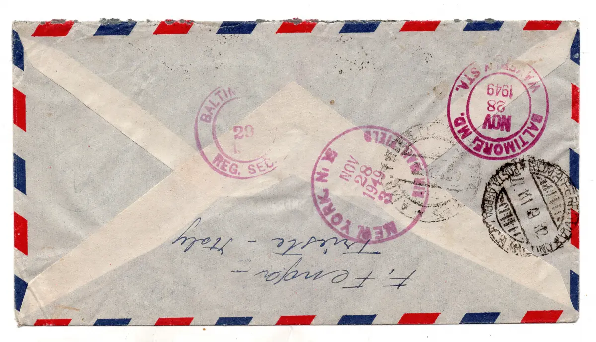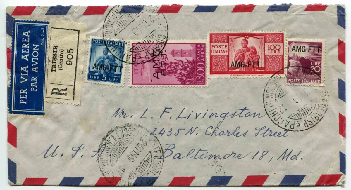 Triest Democratica Lire 100 auf Umschlag Racc. auf dem Luftweg in die USA Umschlag - Democratica Lire 100 (I. Platte) Nr. 67 + Ergänzungen Nr. 59 + 64 + P.A. Nr. 14 auf Umschlag Racc. per Luftweg in die USA am 26.11.49 - Schöner und ungewöhnlicher Code Nr. 619/4