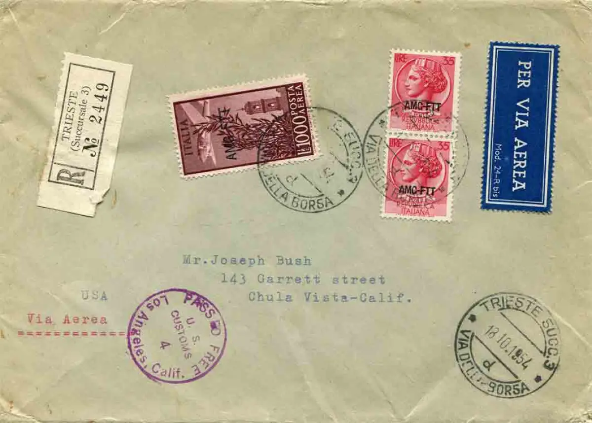 Triest - Lire 1.000 Kapitol auf Umschlag für die USA UMSCHLAG - Luftpost Lire 1.000 Kapitol rotbraun Nr. 26A + komplementäre P.O. Nr. 174 x 2 auf Umschlag Racc. auf dem Luftweg in die USA am 18.10.54 - neben dem Jahrgang der Zensur - Seltene Postnutzung, im Tarif (gr. 70) n. 829/6