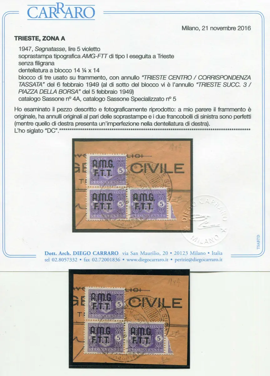 Triest - Segnatasse Lire 5 Nr. 4A Block von drei Exemplaren ohne Wasserzeichen auf kleinem Fragment - Steuermarken Lire 5 Nr. 4A Block von drei Exemplaren ohne Wasserzeichen auf kleinem Umschlagfragment - zwei Exemplare sind einwandfrei, eines mit Zahnfehler rechts - Selten zusammen - Zert. Carraro - Gebraucht Code 806/11