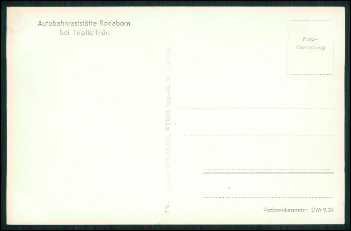Rückseite: unbeschrieben, mit Aufdruck „Autobahnraststätte Rodaborn bei Triptis/Thür.“