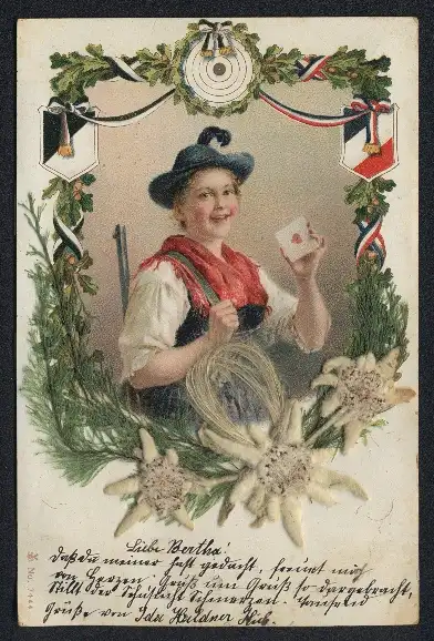 Trockenblumen-AK Eine Jägerin mit einem Bierdeckel, darunter echte Trockenblumen