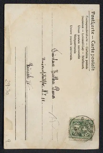 Personenbezogene Daten auf der Rückseite der Karte wurden durch blauen Textmarker unkenntlich gemacht. Die blauen Stellen sind auf die Vorderseite durchgeweicht und wirken sich negativ auf das Postkartenfoto aus