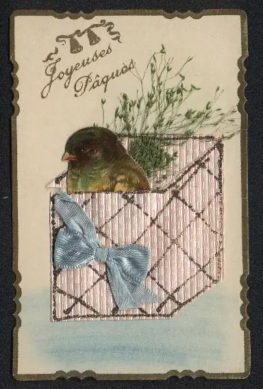 Trockenblumen-AK Vogel in einem Paket mit aufgeklebten Gräsern und Stoffschleife