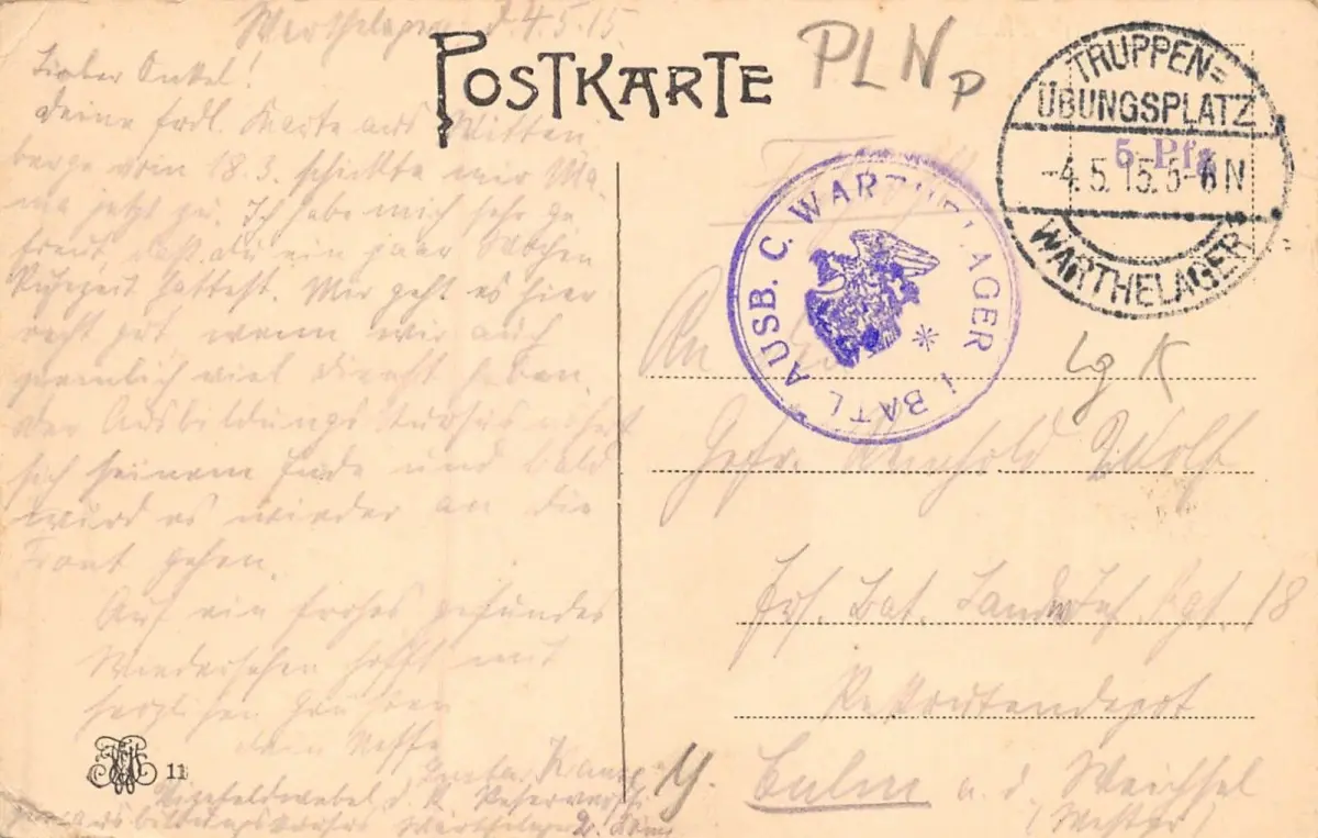 Rückseite: gelaufen 1915 Truppenübungsplatz Warthelager