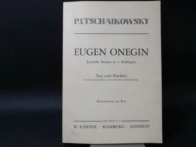 Titel: P.I. Tschaikowsky: Eugen Onegin. Lyrische Szenen in 3 Aufzügen. Text nach Puschkin für die deutsche Bühne von A. Bernhard und M. Kalbeck. Musik von P. Tschaikowsky. Klavierauszug mit Text
