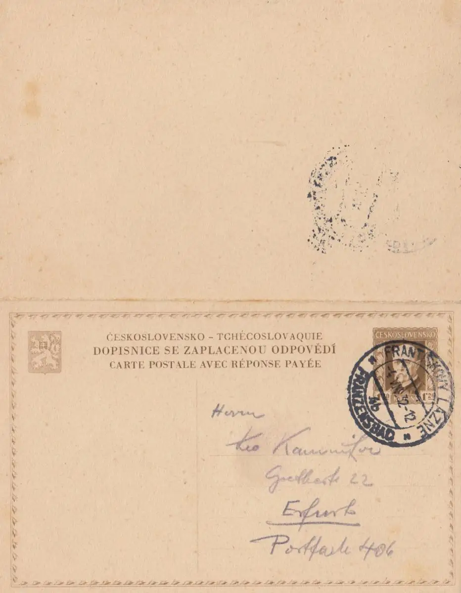 Tschecheslowakei: 1932: Ganzsache nach Erfurt P44 F/A