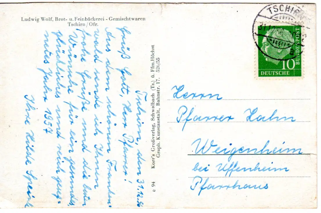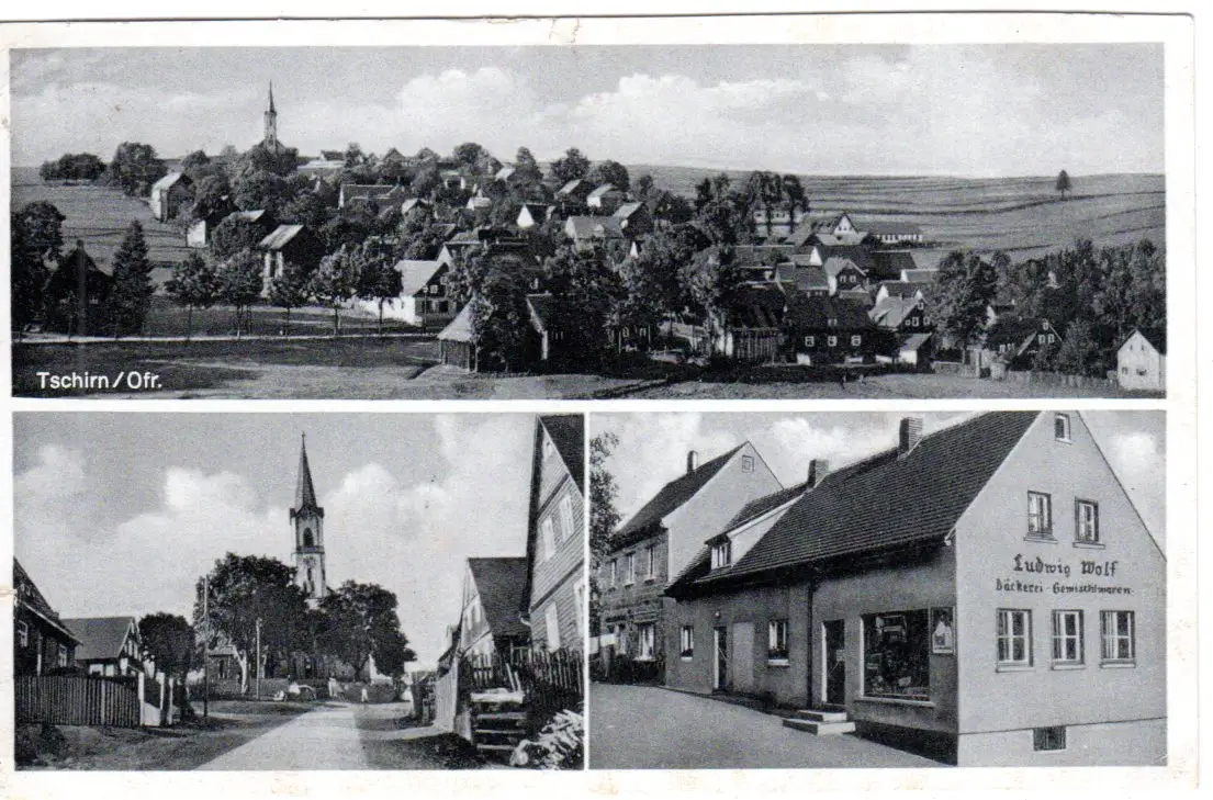 Tschirn m. Bäckeriei L. Wolf, 1956 gebr. sw-AK