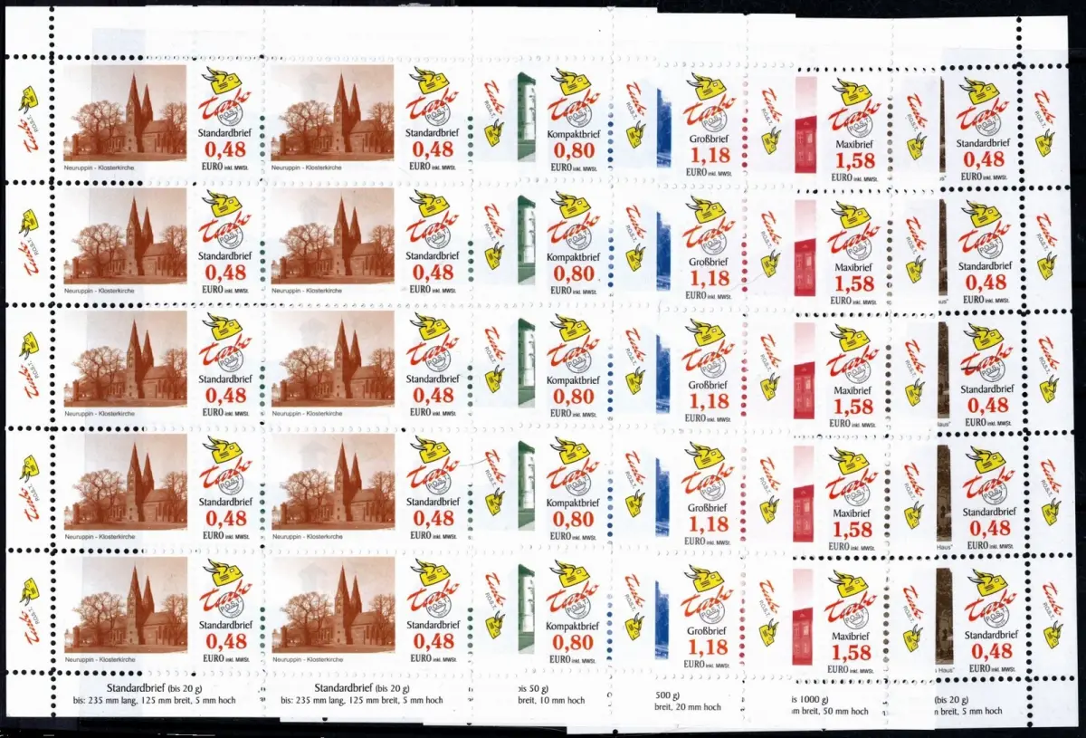• MichSeite Turbopost.: MiNr. 1 A - 5 A, 05.05.2004, "Baudenkmale aus der Region", Schalterbögen, postfrisch Beschreibung \nAusgabeland: Bundesrepublik Deutschland \nPostdienstleister: Turbopost, Neuruppin \nAusgabeanlass: Briefmarkenausgabe "Baudenkmale aus der Region: Rheinsberg, Wittstock / Dosse, Kyritz, Rheinsberg" Katalognummer: MiNr.  1 A - 5 A Ausgabedatum: 05.05.2004 Nominale: 2 x Satz (4 Werte und Wert zu 0,48 EUR, Schalterbögen) zu 0,48 EUR (2 x), 0,80 EUR, 1,18 EUR, 1,58 EUR \nTyp: gez. 10 ¾ \nErhaltung: nassklebend, gezähnt, postfrisch \nHinweis: - Thema: Neuruppin (Klosterkirche), Rheinsberg (Schloss), Wittstock / Dosse (Alte Bischofsburg), Kyritz (Rathaus), Rheinsberg (Schlosshotel "Deutsches Haus")
