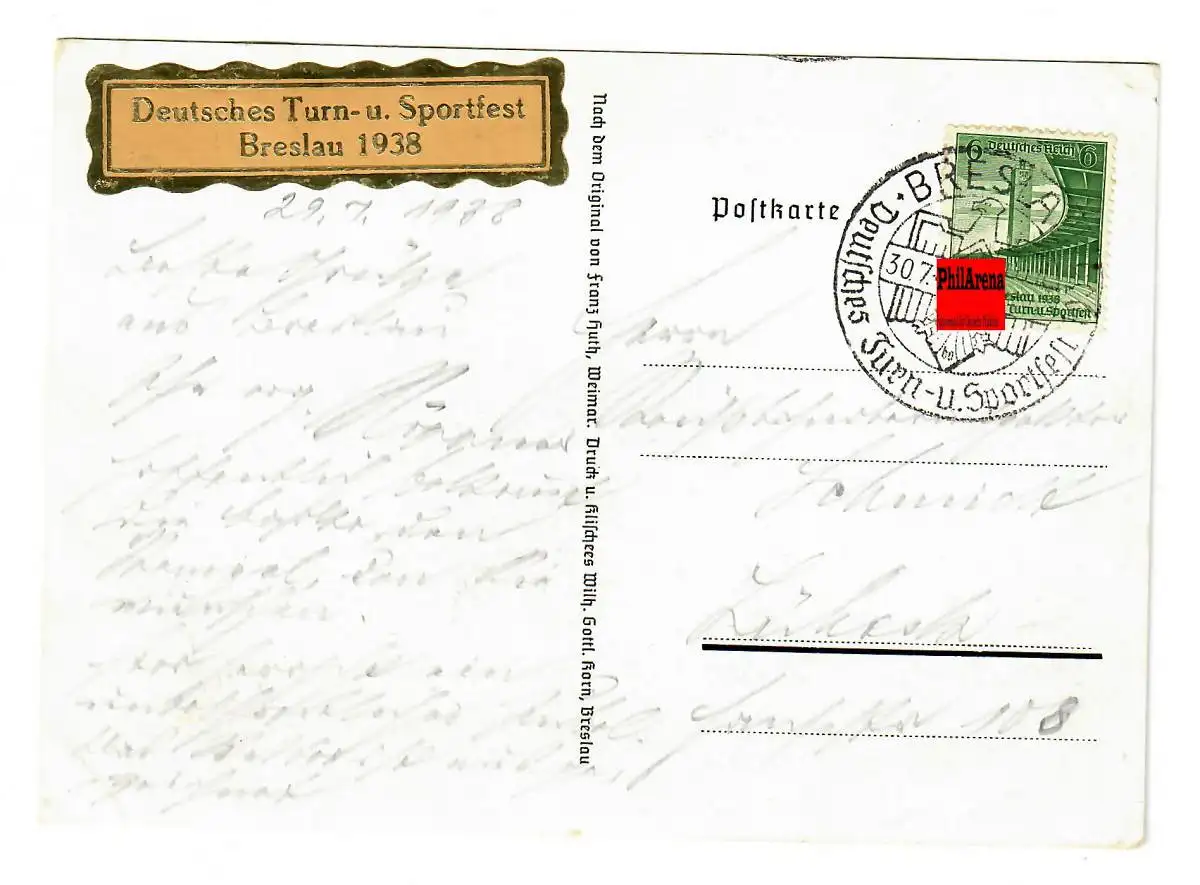 Turn- und Sportfest 1938 in Breslau, mit Vignette und Ansicht Jahrhunderthalle