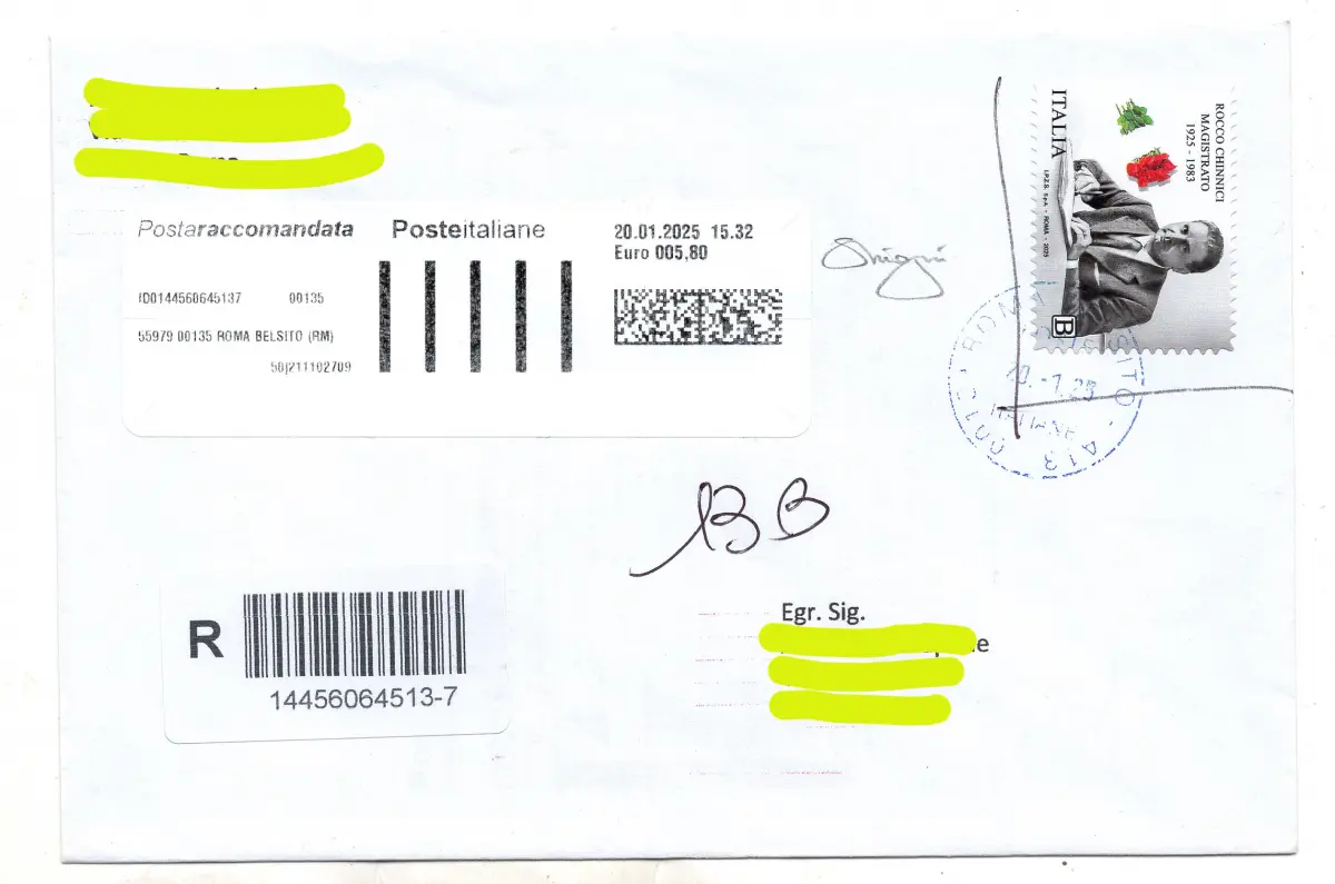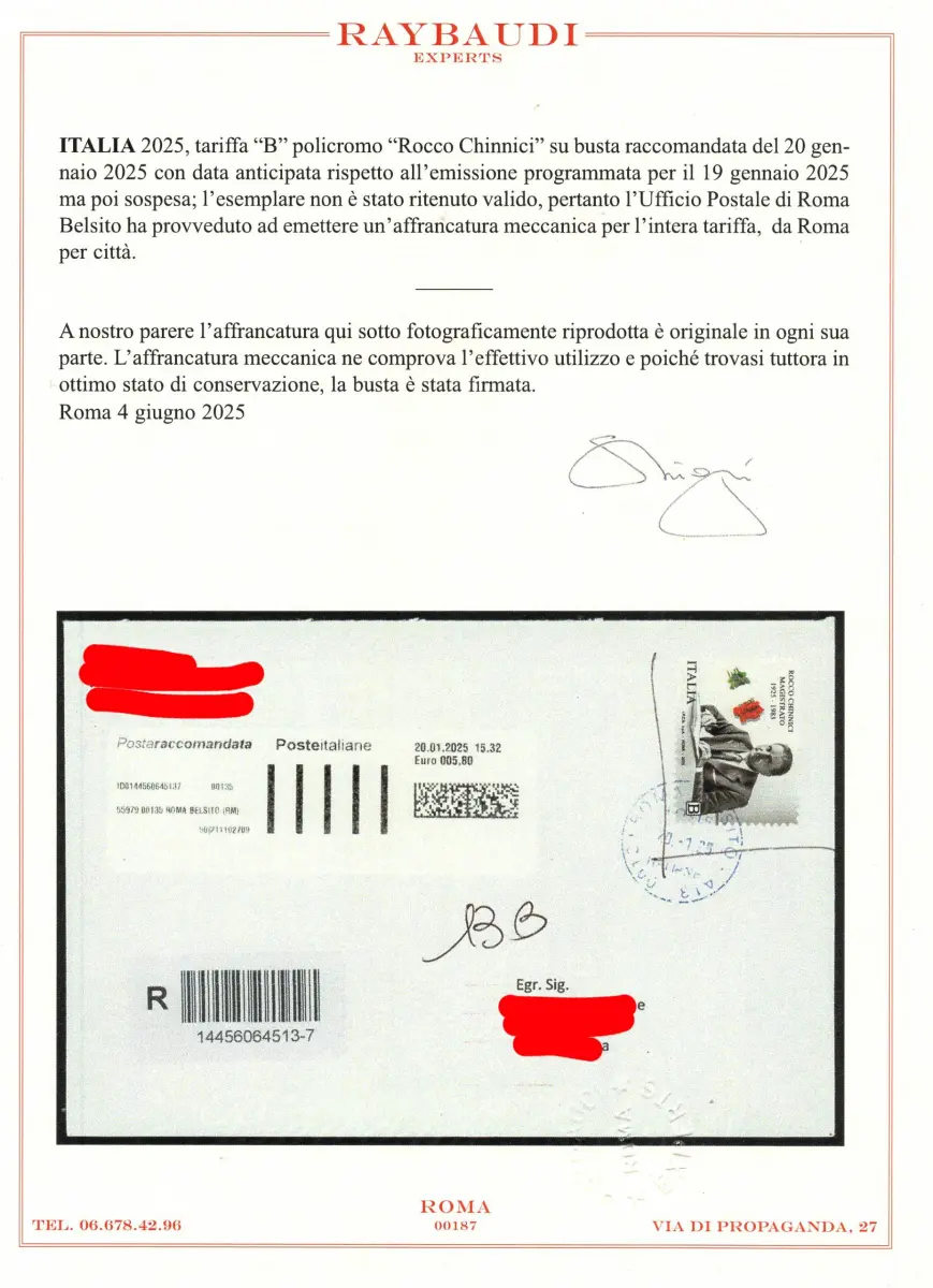 Rocco Chinnici gewidmete Ausgabe auf Einschreiben vom 20. Januar 2025 - Da sich die Ausgabe dieser Briefmarke verschoben hatte, wurde das Exemplar nicht als frankaturfähig angesehen und daher hat die Post das Etikett der mechanischen Frankatur in Höhe von 5,80 Euro ausgestellt (eingeschriebenes erstes Porto) - Seltenes Postgeschichtspapier - Raybaudi Zertifikat Cod. 4040/Web