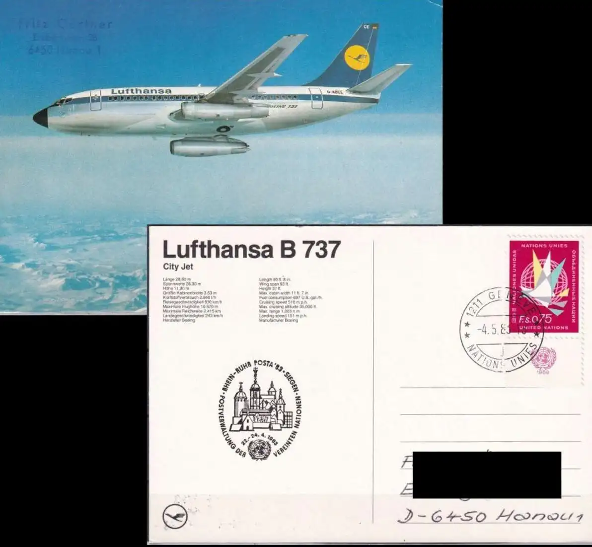 UNO GENF 1983 Postkarte Rhein-Ruhr Post'83 Lufthansa B737