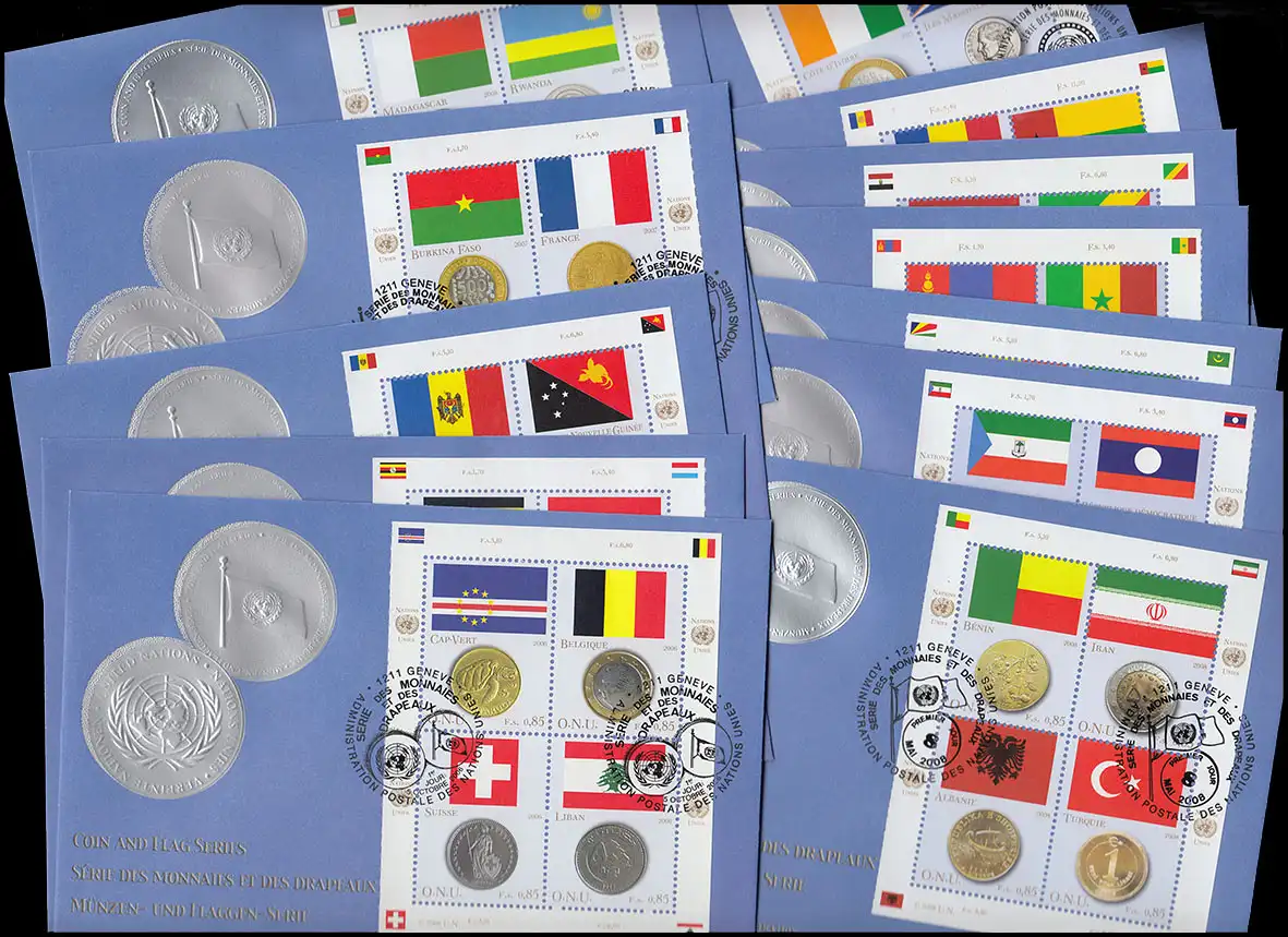UNO Genf: Flaggen und Münzen 2006-2013 Viererblock-Kleinbogen 12 Schmuck-FDC