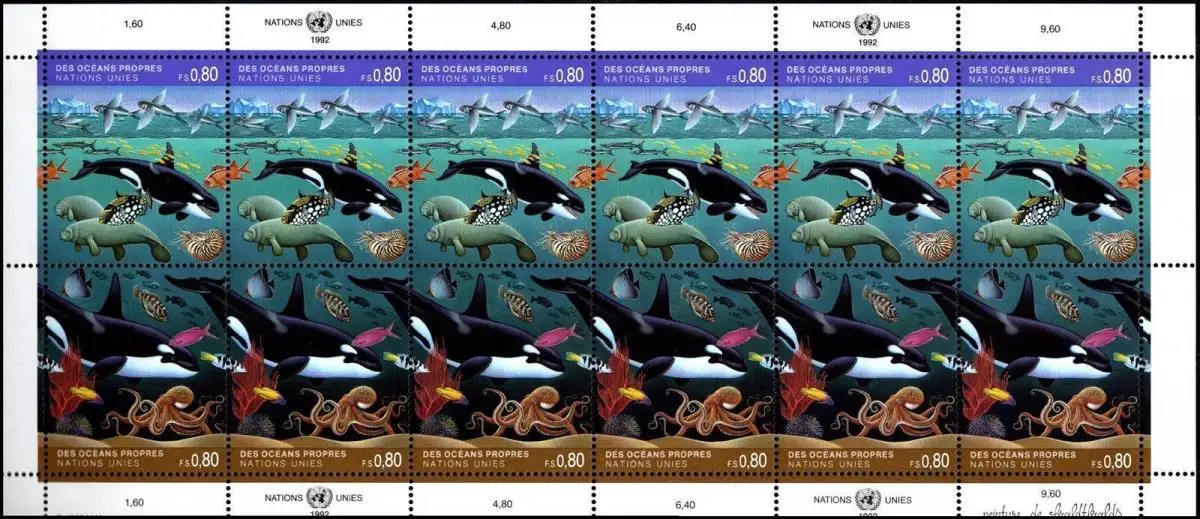 • MichSeite UNO Genf: MiNr. 213 - 214 KB, 13.03.1992, "Saubere Meere", Kleinbogen. postfrisch Beschreibung \nAusgabeland: UNO Herausgeber: Postverwaltung der Vereinten Nationen, Genf \nAusgabeanlass: Briefmarkenausgabe "Saubere Meere" Katalognummer: MiNr. 213 - 214 KB Ausgabedatum: 13.03.1992 Nominale: Satz (2 Werte, Zusammendruck) zu 0,80 SFR (12 x) \nTyp: - \nErhaltung: Kleinbogen, postfrisch Zudruck-: - \nHinweis: 1 Kleinbogen