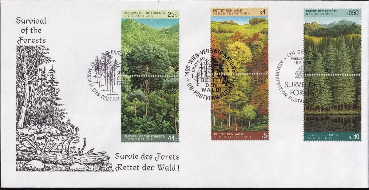 UNO NEW YORK - WIEN - GENF 1988 TRIO-FDC Rettet den Wald