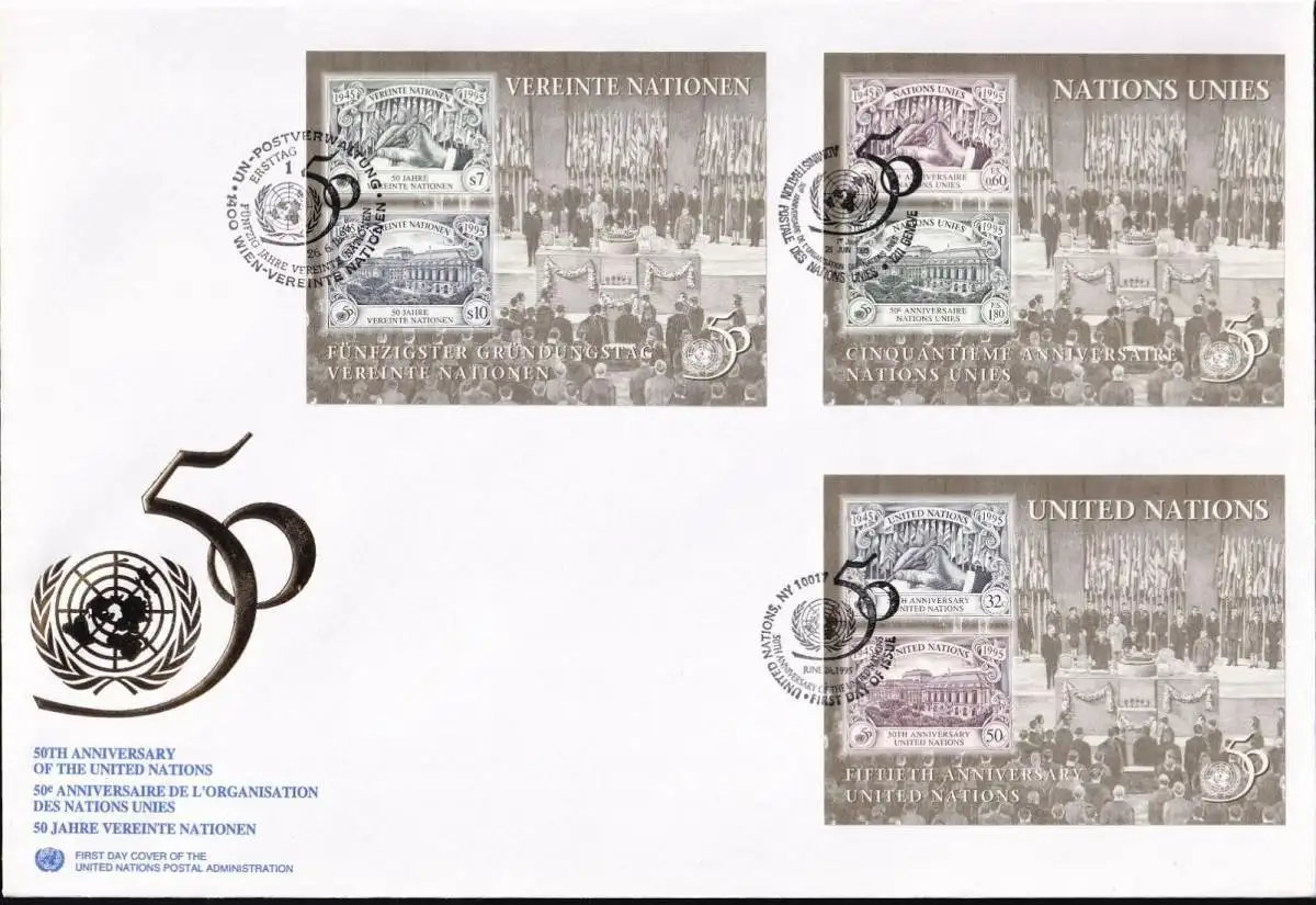 UNO NEW YORK - WIEN - GENF 1995 TRIO-FDC 50 Jahre Vereinte Nationen