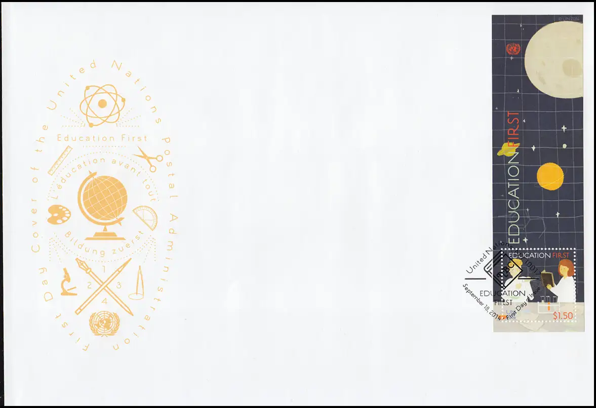 UNO New Block 40 Bildung zuerst! - Block auf Schmuck-FDC N.Y. 2014