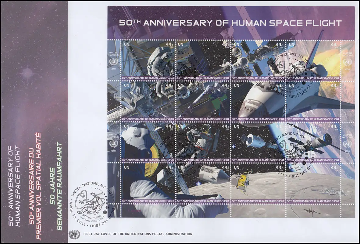 UNO New York 1254-1269 50 Jahre bemannte Raumfahrt 2011: Kleinbogen Schmuck-FDC