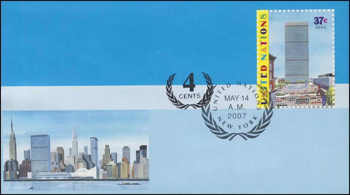 UNO New York Umschlag U 17A Hauptquartier 37+4 C. 2007, 165x92, FDC 14.5.2007