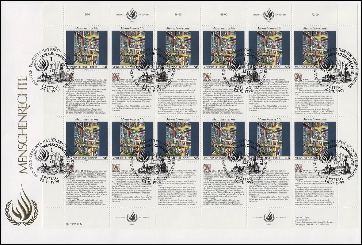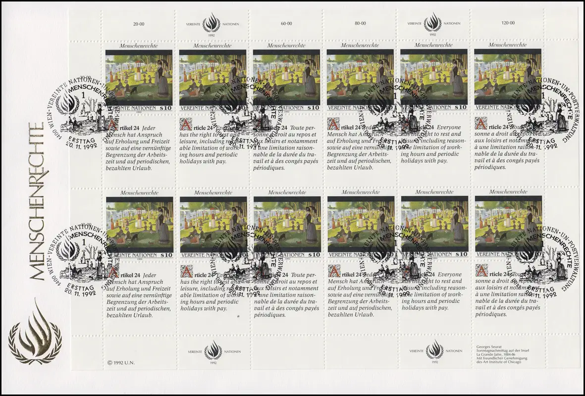 UNO Wien 139-140 Menschenrechte, Kleinbogen-Satz auf 2 Schmuck-FDC WIEN 1992