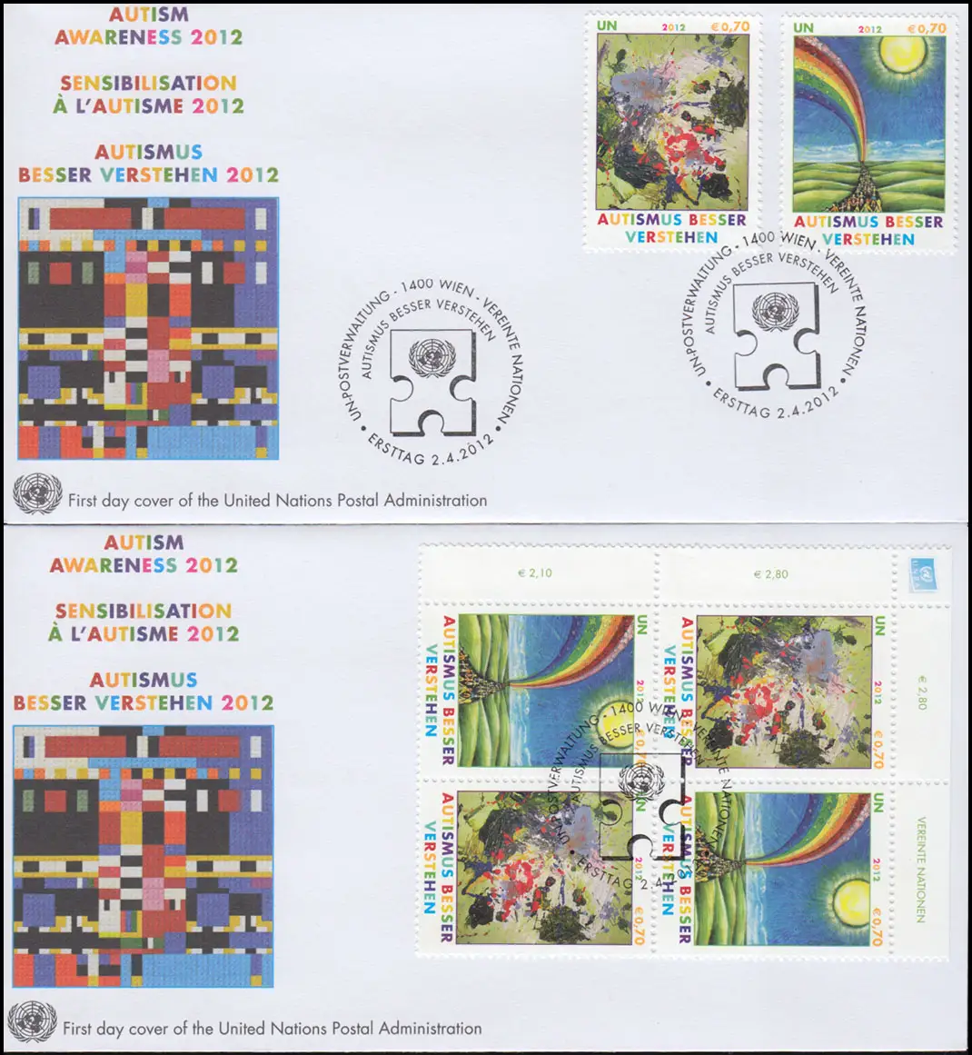UNO Wien Autismus besser verstehen: Satz und ER-Viererblock-ZD auf 2 Schmuck-FDC
