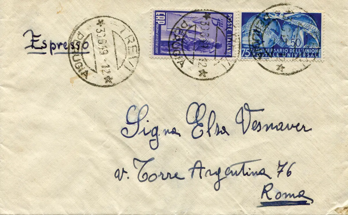 UPU Lire 50 Nr. 599 + Ergänzung Nr. 602 auf Expressumschlag von Trevi nach Rom am 30.6.49 Cod. 285/15
