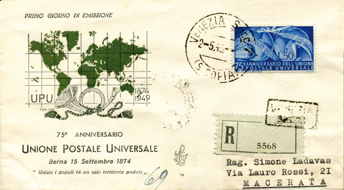 U.P.U. Nr. 599 auf eingeschriebenem Reiseumschlag für Macerata mit Ankunftsstornierung - Ungewöhnlich Cod. 332/16